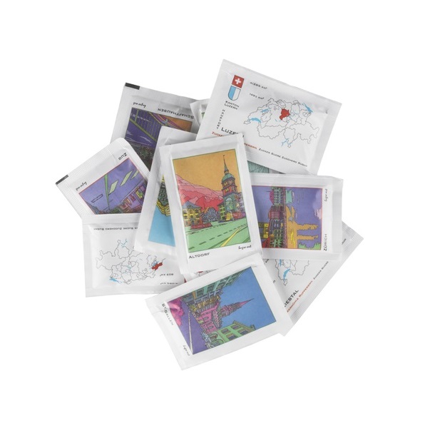 Illustrationen aller 26 Kantonshauptorte zieren diese Zuckerbeutelserie. Die Beutel sind mit je 5 Gramm Zucker gefüllt. Erhältlich in