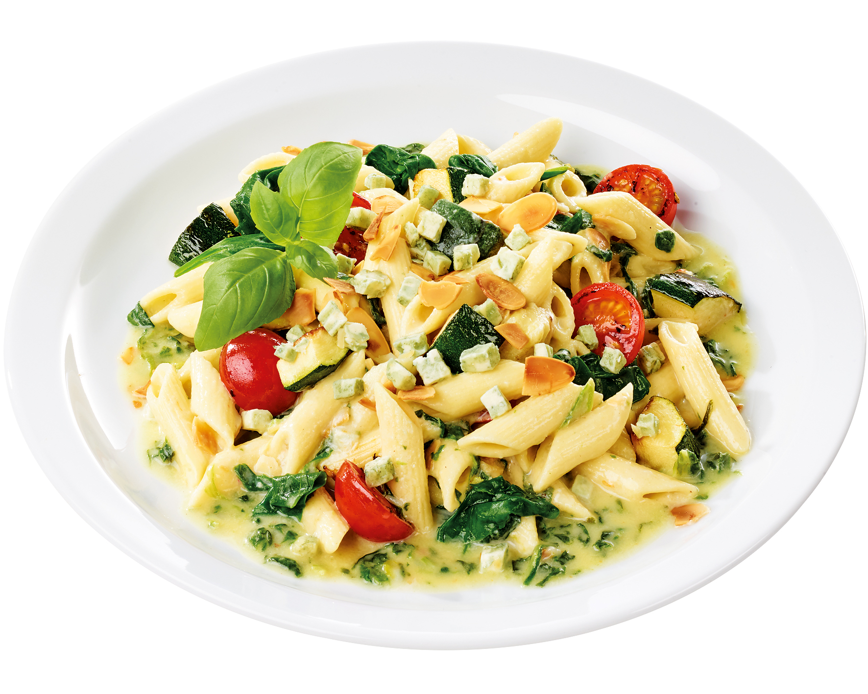 in Blauschimmel-Käsesauce, mit Zucchini, Cherrytomaten, Spinat und Mandeln. Portionsgewicht 420g