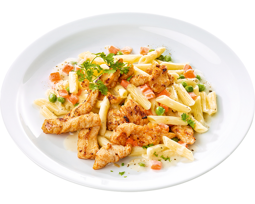auf Penne, in sahniger Zitronensauce mit Gemüse. Portionsgewicht 430g