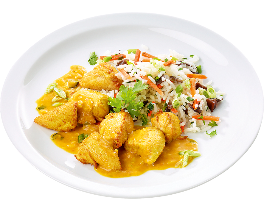 Hähnchenbrustfiletstücke in sahniger Currysauce, Reis mit Mu Err-Pilzen, Lauchzwiebeln und Karotten. Portionsgewicht 430g
