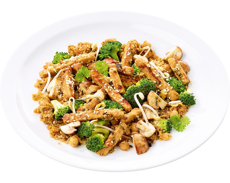 mit scharf marinierten Soja-Streifen, Kichererbsen, Broccoli, Champignons, Mungobohnenkeimlingen und Sesam. Portionsgewicht 380g
