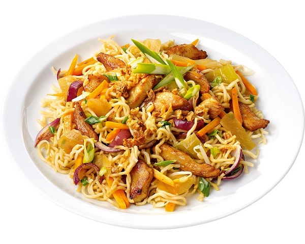 Asia-Nudeln mit Huhnfleischstreifen, Gemüse und Ingwer. Portionsgewicht 450g