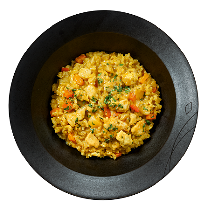 Gelbes Linsencurry mit Reis, Kichererbsen und Gemüse